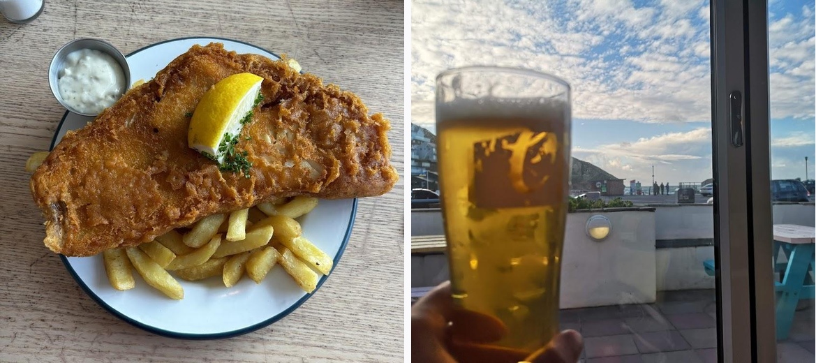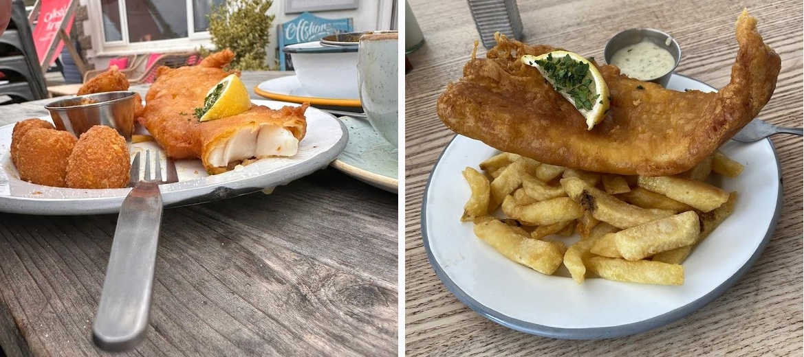The fish and chips at this place was the best I’ve ever had period !! Came for a birthday afternoon dinner and although it’s more expensive than your standard fish and chip and place it’s more than value for money , the fish itself was fresh to death and the batter was crispy , the chips were fluffy in the inside and crunchy on the outside exactly what you want from a chip. With a beautiful backdrop of the beach and surrounding cliffs and harbour I would definitely recommend this for place to anyone.